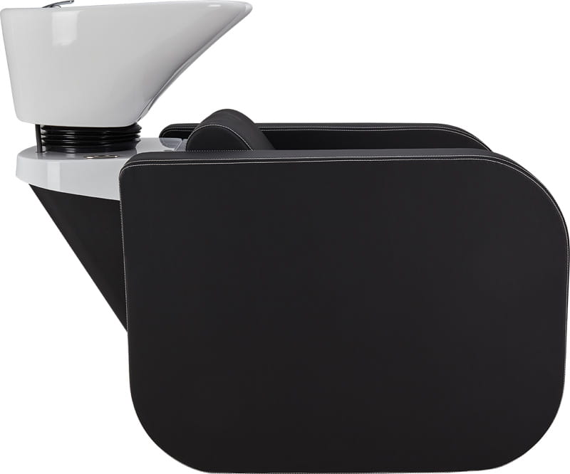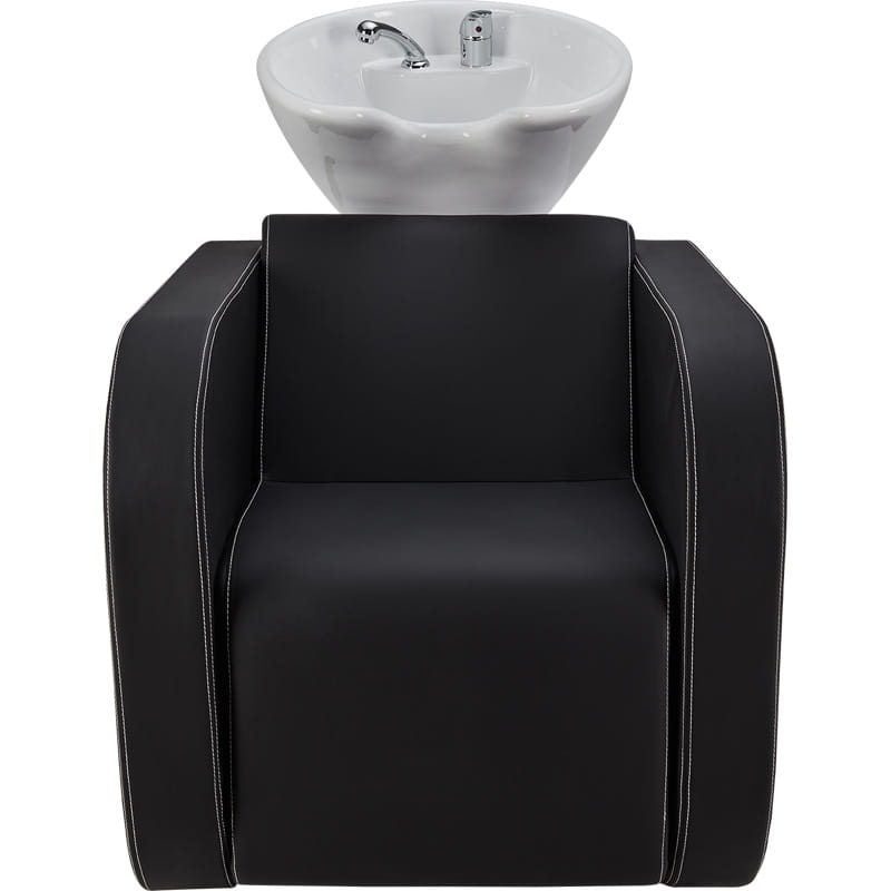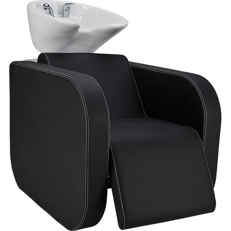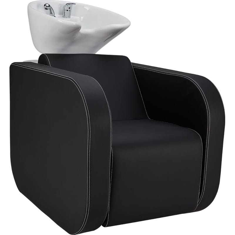 Elegancka myjnia fryzjerska z zaokrąglonymi podłokietnikami. Przeszycia w kontrastującym kolorze nadają jej niepowtarzalnego charakteru.